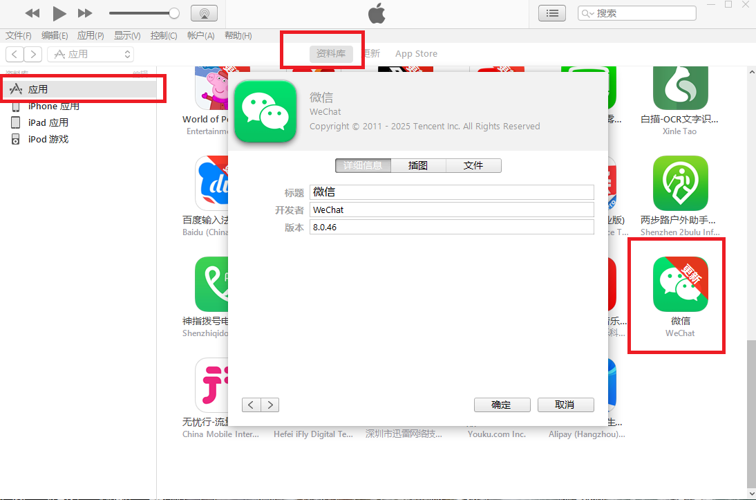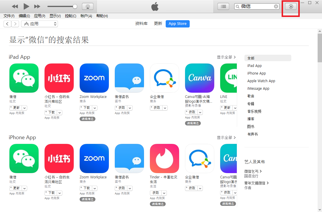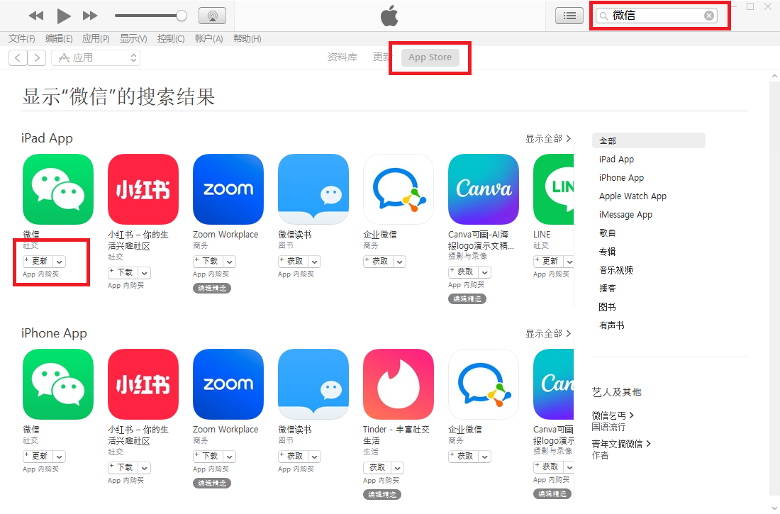 我之前下载过,微信这里显示-更新,如果没在iTunes下载过的会显示-下载